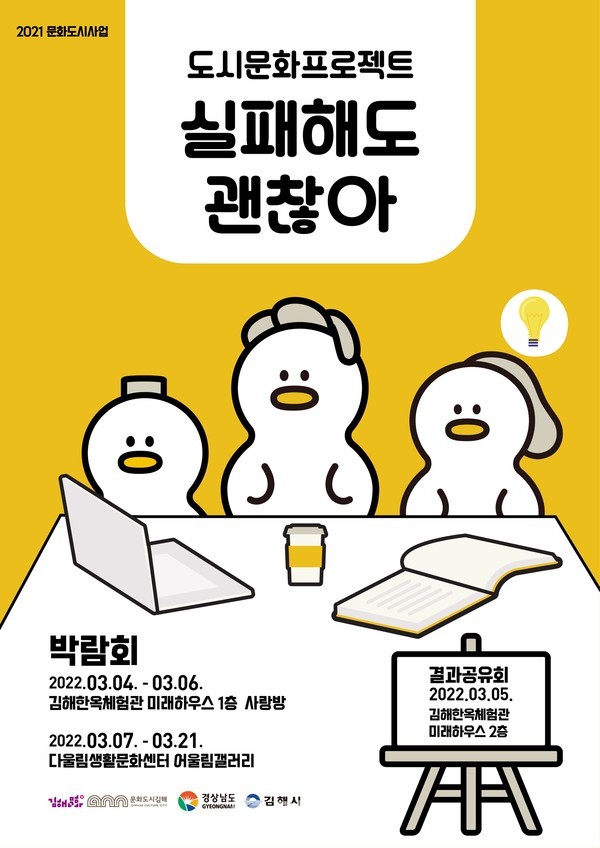 (재)김해문화재단 문화도시센터는 4일부터 21일까지 18일간 도시문화프로젝트 '실패해도 괜찮아' 박람회와 결과 공유회를 개최한다.