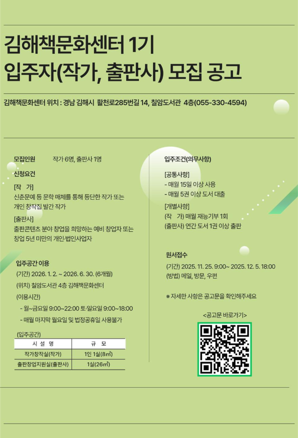 내달 공식 개관하는 김해책문화센터가 작가창작실과 출판창업지원실에 입주할 입주자를 모집한다.